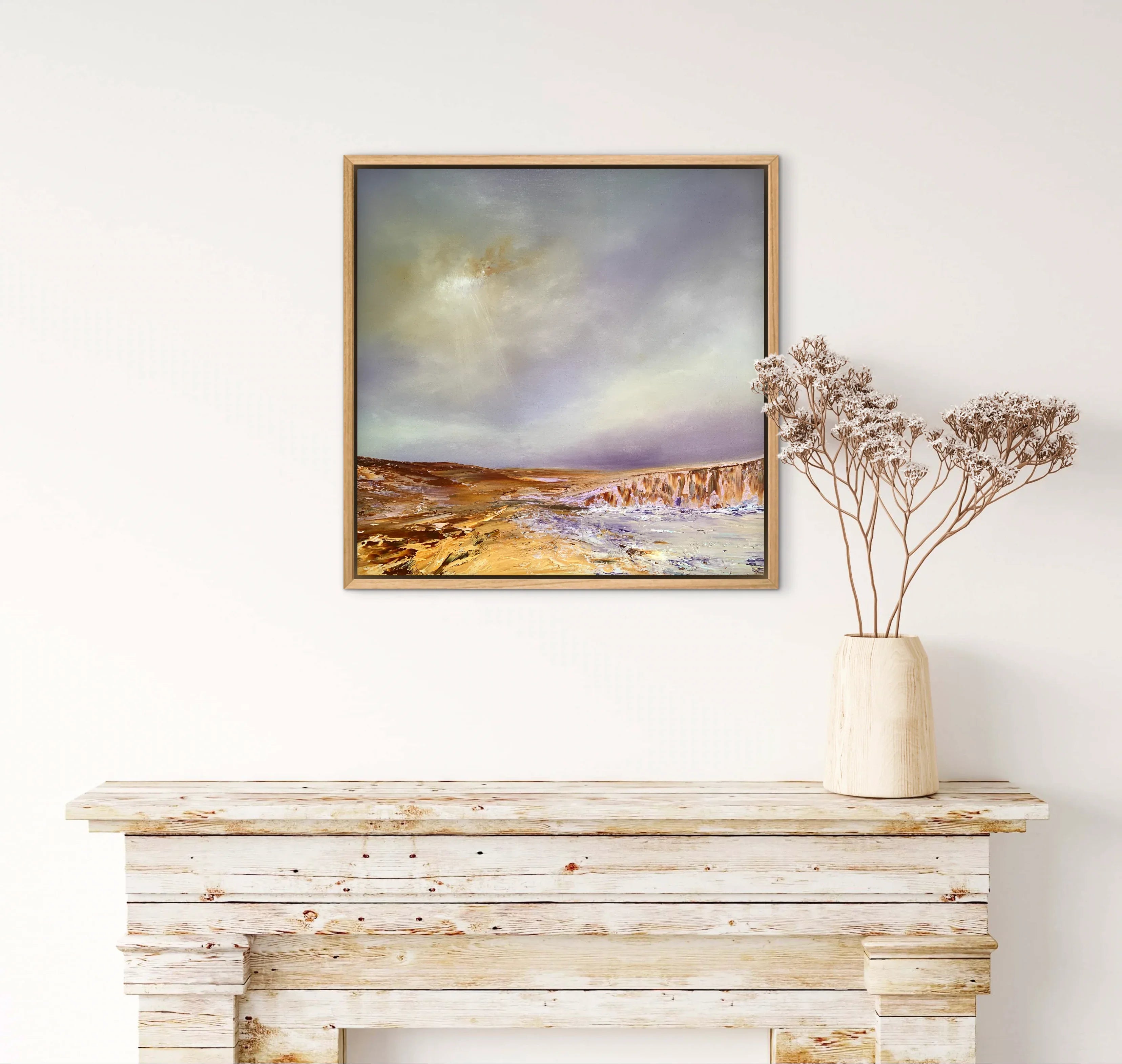 This painting evokes the raw energy and drama of a rugged coastline. Waves surge toward cliffs while shafts of sunlight pierce a purple sky, casting luminous amber tones across the landscape.