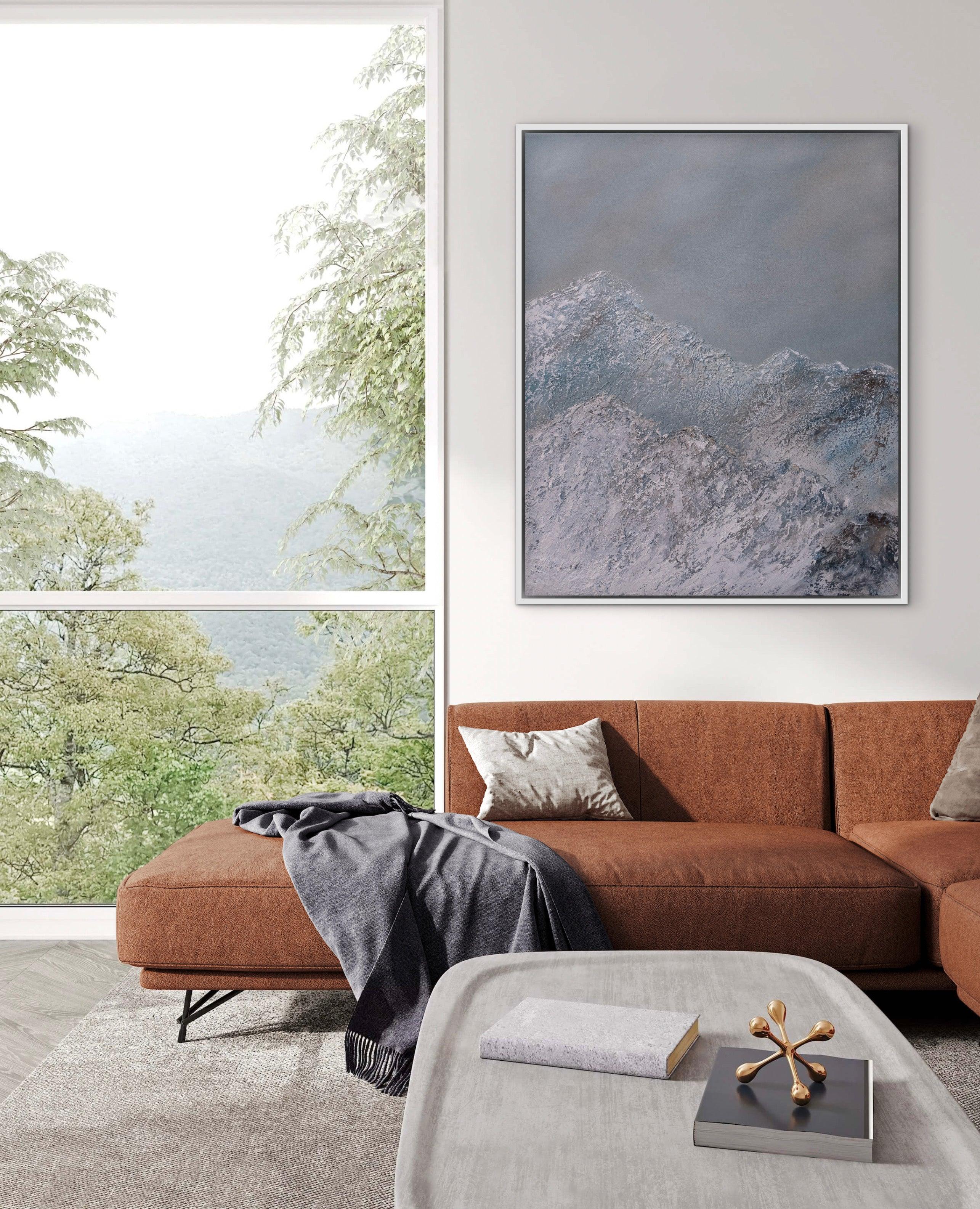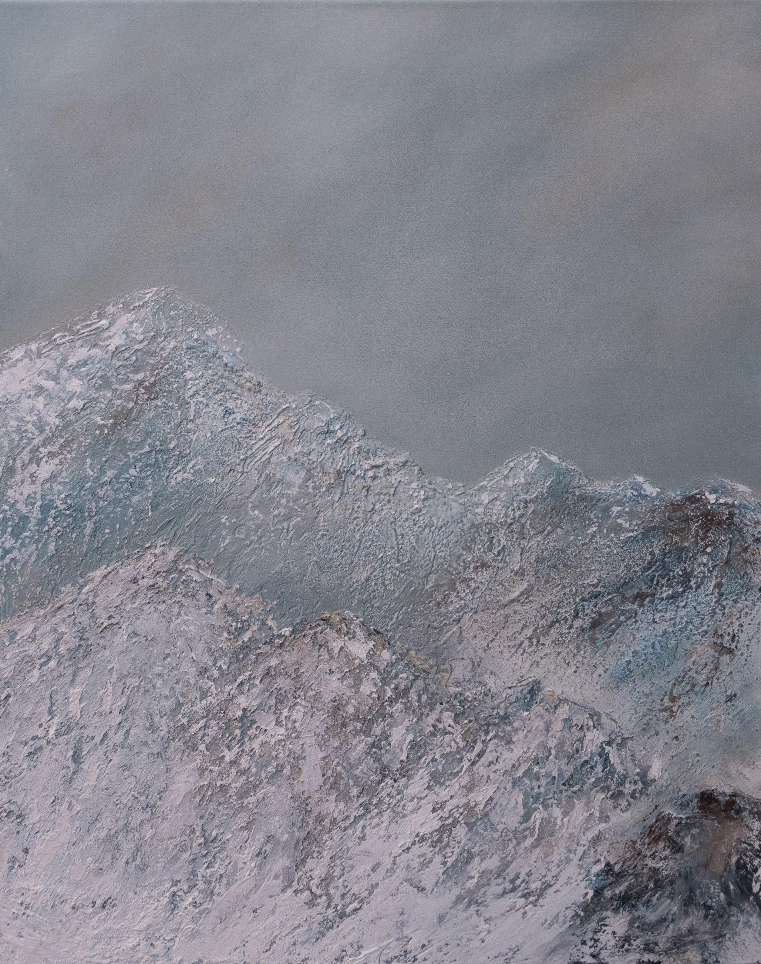 Double Mountain by Guy Trinquet is an original painting of rugged mountain peaks in blue-grey winter mist. Serene, atmospheric, and majestic.