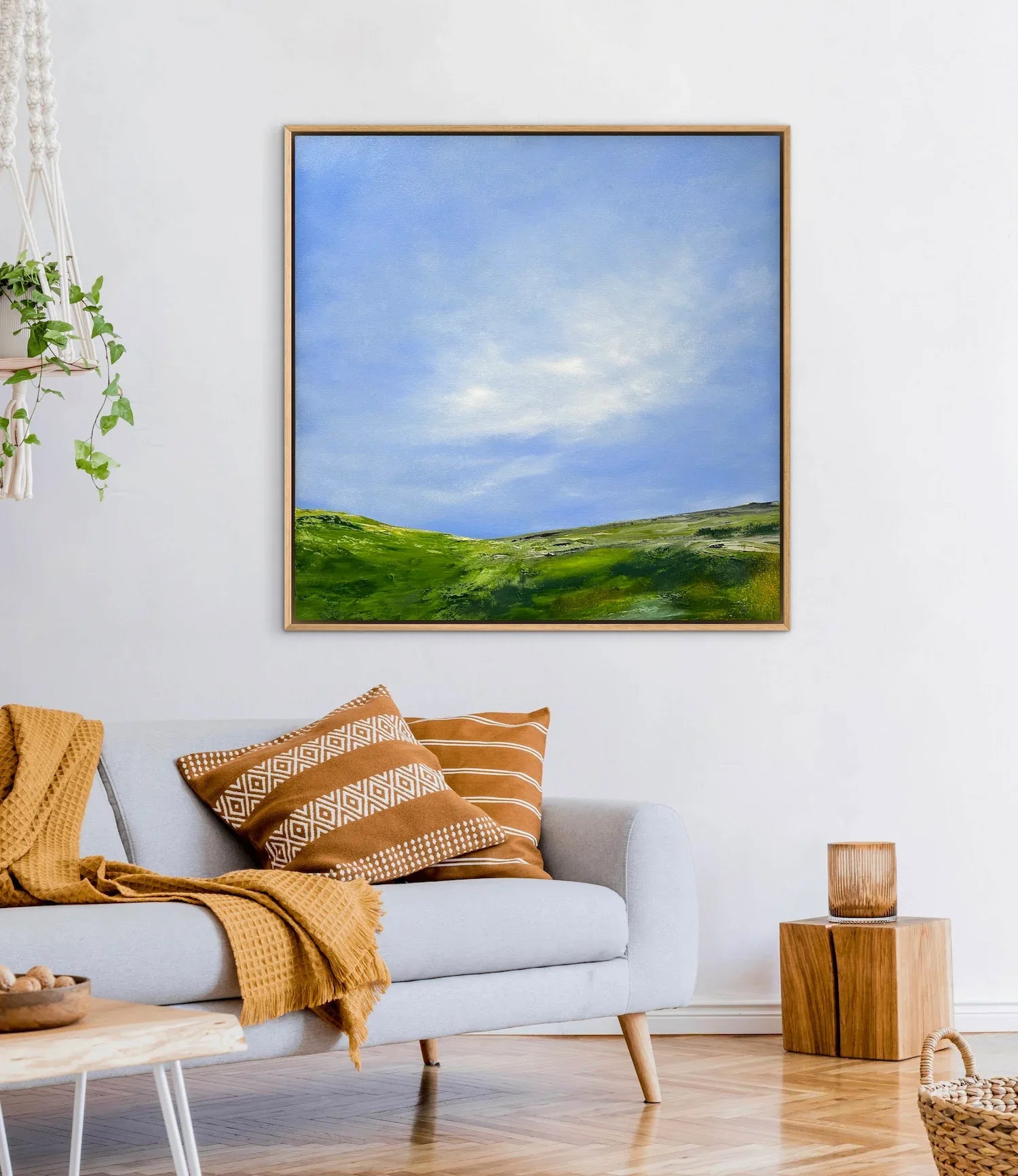 In Fresh, Guy Trinquet captures the essence of a peacful day in the countryside through the illusion of detail. Hills in greens and gentle yellows lead the eye toward a peaceful pond tucked into the landscape. Above, white clouds sweep gracefully across an open blue sky, adding movement and softness.