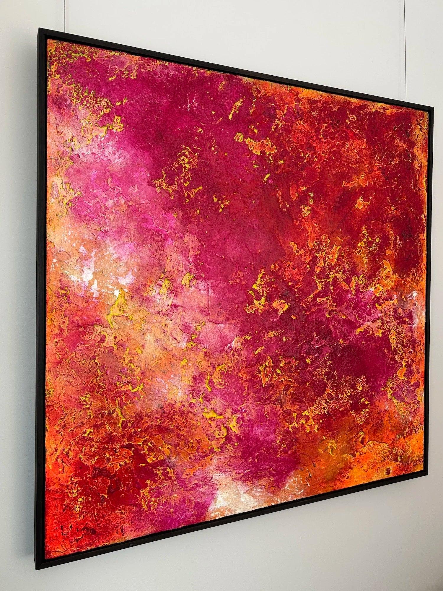 A vibrant mix of fiery oranges, yellows, and magentas, layered with rich textures, brings the intricate beauty of coral to life in abstract form.