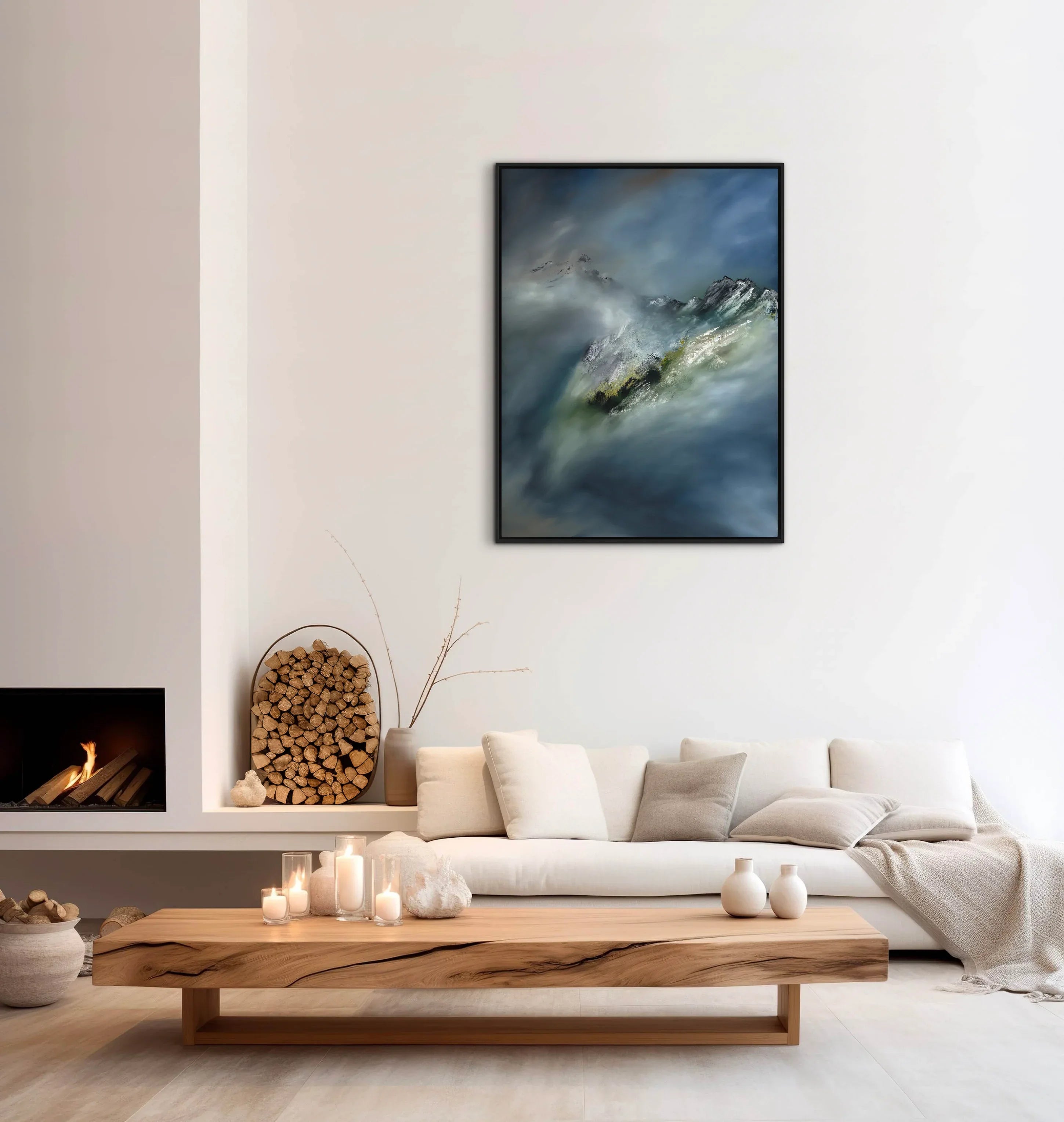 Mystic Mountain captures the allure of peaks veiled in mist and clouds. Grey-blue shades create a sense of movement and secrecy, evoking a hidden, sacred space. This limited edition painting blends intrigue, calm, and contemporary design, making it a captivating focal point for modern interiors.