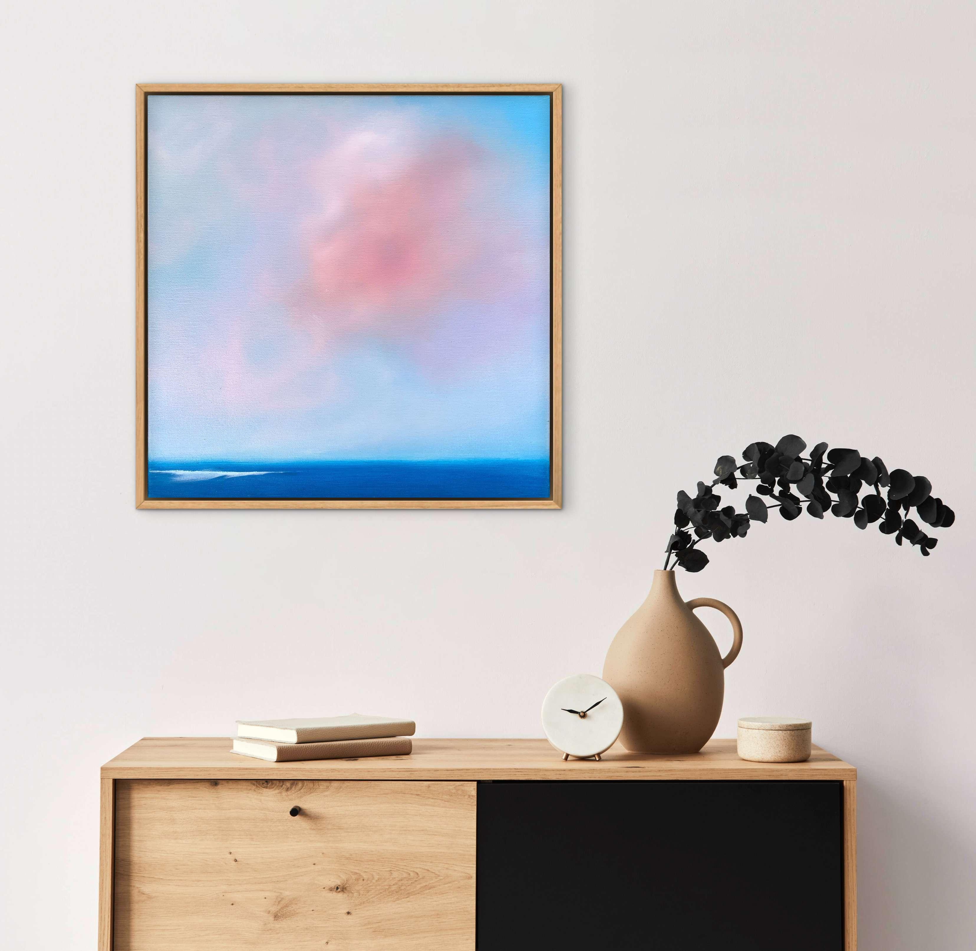 Soft pink clouds float above the sea. This original coastal painting is both calm and whimsical.